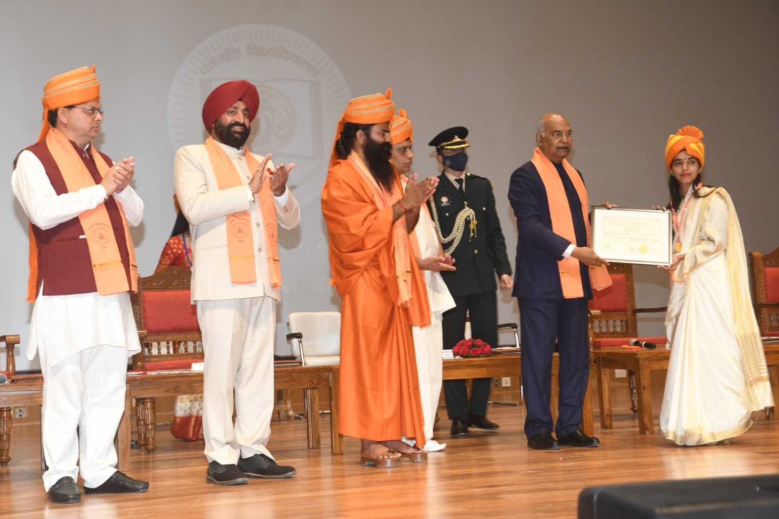 हरिद्वार। राष्ट्रपति राम नाथ कोविन्द ने पतंजलि विश्वविद्यालय, हरिद्वार के प्रथम दीक्षांत समारोह में गोल्ड मेडलिस्ट विद्यार्थियों को उपाधि प्रदान की। इस अवसर पर राज्यपाल लेफ्टिनेंट जनरल गुरमीत सिंह (से. नि.), मुख्यमंत्री पुष्कर सिंह धामी, उच्च शिक्षा मंत्री डॉ. धन सिंह रावत, पतंजलि विश्वविद्यालय के कुलाधिपति स्वामी रामदेव, कुलपति आचार्य बालकृष्ण, संकाय अध्यक्षा डॉ. साधवी देवप्रिया भी उपस्थित थे। राष्ट्रपति रामनाथ कोविन्द ने कहा कि आधुनिक विज्ञान के साथ हमारी परंपरा की प्रासंगिक ज्ञान-राशि को जोड़ते हुए भारत को नॉलेज सुपर पावर बनाने का जो लक्ष्य राष्ट्रीय शिक्षा नीति ने निर्धारित किया है उस मार्ग पर पतंजलि विश्वविद्यालय अग्रसर है। उन्होंने पुरस्कार प्राप्त करने वाले छात्र-छात्राओं तथा स्नातक, स्नातकोत्तर और पीएचडी की उपाधियां प्राप्त करने वाले सभी विद्यार्थियों को बधाई देते हुए उनके उज्ज्वल भविष्य की कामना की।