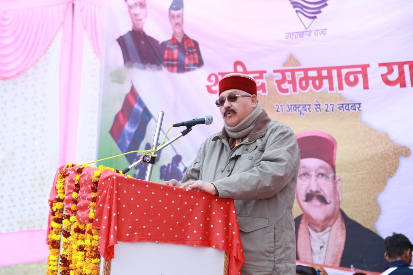 इस मौके पर शहीद सैनिकों के परिजनों एवं स्थानीय जनता को संबोधित करते हुए कैबिनेट मंत्री एवं क्षेत्रीय विधायक सतपाल महाराज ने कहा कि सैनिक परिजनों का सम्मान हमारे लिए गर्व की बात है। शहीद सैनिकों से  हमें प्रेरणा लेनी चाहिए कि हम जो भी कार्य करें राष्ट्र निर्माण की भावना से करें। उन्होने कहा कि देहरादून में निर्मित होने वाले पांचवें धाम सैन्य धाम के निर्माण हेतु प्रत्येक शहीद के गांव के आंगन से पवित्र माटी सैनिक सम्मान रथ यात्रा द्वारा ताम्र कलश में ले जायी जा रही है। हमारे चार विकास खंडों के शहीदों के गांव के आँगन से भी मिट्टी को ताम्र कलशों के माध्यम से सैन्य धाम पहुंचाया जायेगा जो कि हमारे क्षेत्र के लिए सम्मान की बात है।