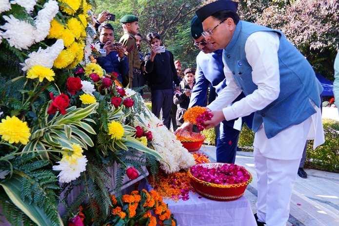 देहरादून के गांधी पार्क में आयोजित विजय दिवस समारोह में मुख्यमंत्री पुष्कर सिंह धामी ने शहीद स्मारक पर पुष्प चक्र अर्पित कर वीर शहीदों को श्रद्धांजलि दी। उन्होंने 1971 के युद्ध के गौरव को याद करते हुए कहा कि यह युद्ध भारत के स्वाभिमान और मानवता की रक्षा का प्रतीक है।